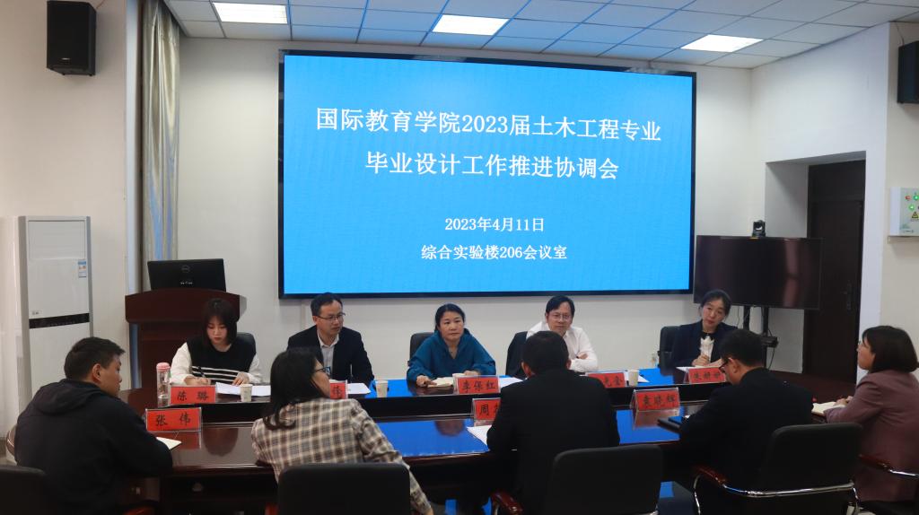 为确保2023届土木工程专业(中外合作办学)本科毕业设计的顺利完成, 4月11日下午,在综合实验楼206会议室,十大体育网站与国际教育公司联合召开2023届土木工程专业(中外合作办学)毕业设计推进会。国际教育公司经理李保红、副经理姚光金、副书记付春锋、教学秘书朱妍妍、2023届土木工程专业(中外合作办学)班主任陈璐;十大体育网站经理周葆春、副经理袁晓辉、土木系主任高春华、教学秘书李卉、毕业设计指导教师代表张伟参会。