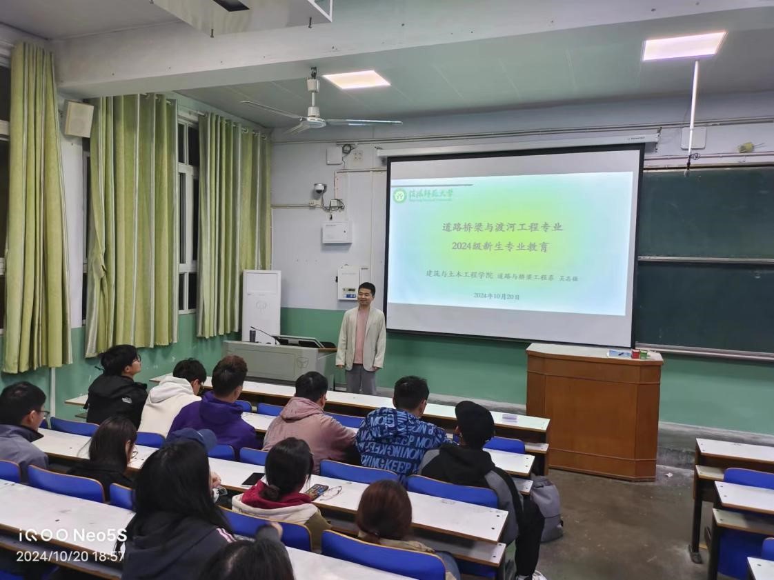 1020日下午,道路与桥梁工程系在J2-T5教室举行了道路桥梁与渡河工程专业新生入学教育活动。道路与桥梁工程系负责人吴志强、系内部分教师代表及全体道路桥梁与渡河工程专业新生参加了活动。吴志强首先从国家交通强国战略出发,详细介绍了道路桥梁与渡河工程专业的发展现状和美好前景,鼓励新生坚定专业信心。随后,重点讲解了专业培养目标和课程体系,帮助新生更好地了解学业内容并做好学习规划。最后,教师代表们与新生就专业课程学习、继续深造、职业发展等问题进行了深入交流,并希望新生转变思想,变被动学习为主动学习,以崭新的积极姿态迎接老员工活,培养扎实的专业知识和实践能力,为将来成为优秀的道路桥梁与渡河工程师打下坚实基础。