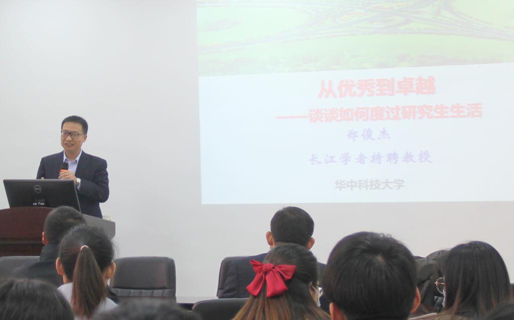 11月8日上午,应十大体育网站邀请,华中科技大学土木与水利工程公司郑俊杰教授在十大体育网站206会议室作了题为“从优秀到卓越——谈谈如何度过研究生生活”的学术报告。党委书记方明科、经理周葆春、副经理肖琪聃、马文强老师和全体研究生参加了此次报告会,会议由周葆春主持。