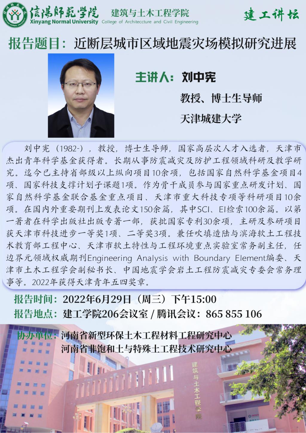 报告人简介:刘中宪(1982-),教授,博士生导师,国家高层次人才入选者,天津市杰出青年科学基金获得者。长期从事防震减灾及防护工程领域科研及教学研究。迄今已主持省部级以上纵向项目10余项,包括国家自然科学基金项目4项、国家科技支撑计划子课题1项。作为骨干成员参与国家重点研发计划、国家自然科学基金联合基金重点项目、天津市重大科技专项等科研项目10余项。在国内外重要期刊上发表论文150余篇,其中SCIEI检索100余篇。以第一著者在科学出版社出版专著一部,获批国家专利30余项,主研及参研项目获天津市科技进步一等奖1项、二等奖3项。兼任吹填造陆与滨海软土工程技术教育部工程中心、天津市软土特性与工程环境重点实验室常务副主任,任边界元领域权威期刊Engineering Analysis with Boundary Element编委、天津市土木工程学会副秘书长、中国地震学会岩土工程防震减灾专委会常务理事等。2022年获得天津青年五四奖章。