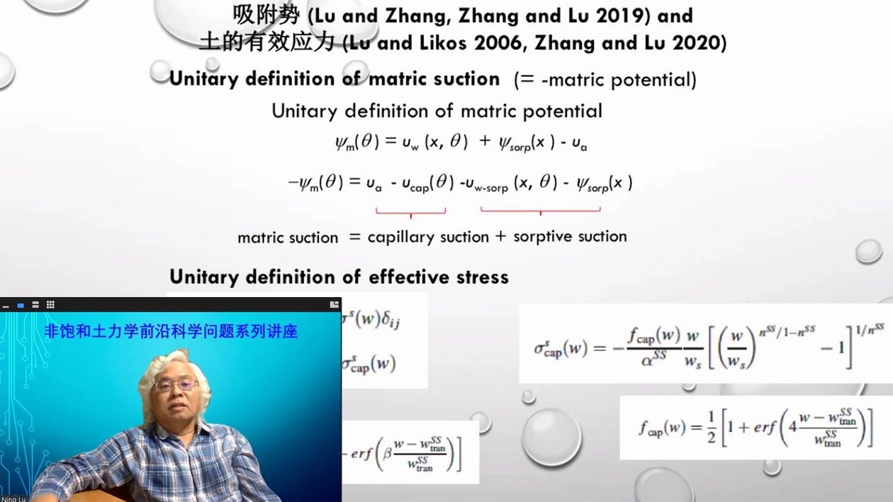 9月16日至11月18日,应十大体育网站邀请,美国科罗拉多矿业大学Ning Lu(卢宁)教授开设的18讲“非饱和土力学前沿科学问题系列云讲座”落幕,该系列讲座聚焦于非饱和土力学前沿领域,围绕土的吸附势(Soil sorptive potential)与土的有效应力(Soil effective stress)2大主题,18讲内容分别为: