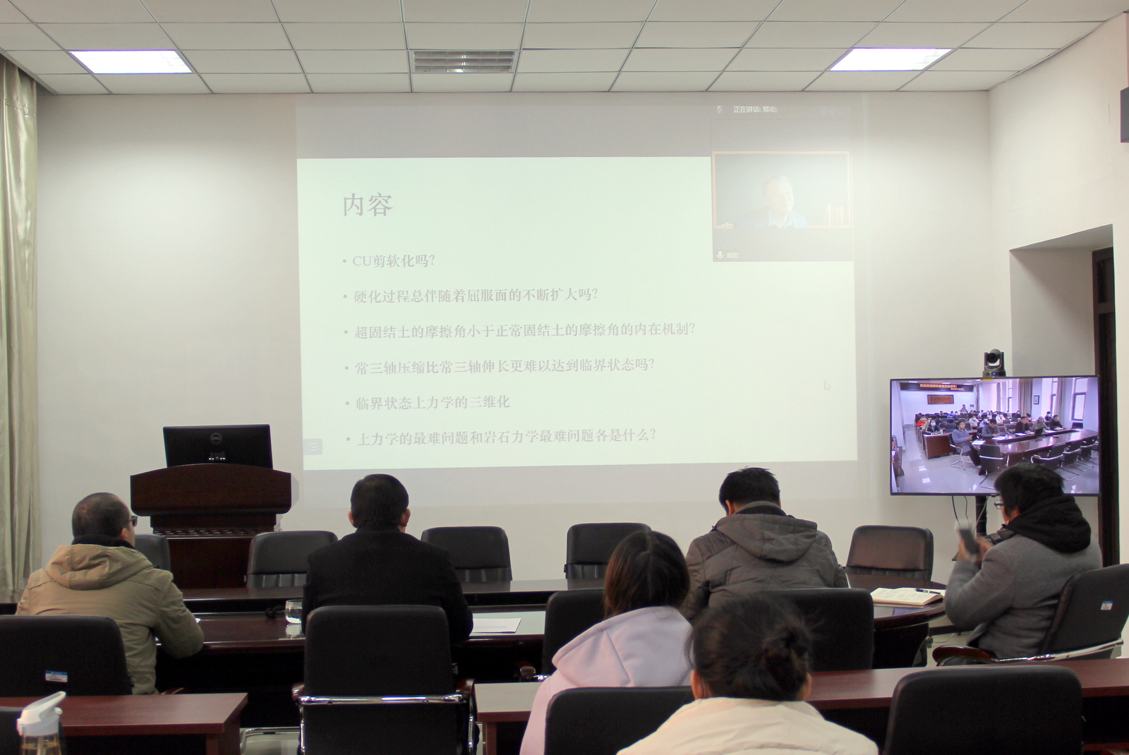 12月5日,应十大体育网站邀请,北京工业大学郑宏教授通过腾讯会议平台为公司师生作了题为“土力学研习的几个心得和疑惑”的学术报告。来自北京工业大学、中科院武汉岩土所、同济大学、东南大学、哈尔滨工业大学、天津大学、北京航空航天大学、中山大学、武汉大学、中南大学、山东大学、重庆大学、河海大学、上海大学、中国地质大学、西南交通大学、南京工业大学、贵州大学、湘潭大学、华东交通大学、湖南科技大学、三峡大学、湖北工业大学、华北水利水电大学、郑州航空工业管理公司和公司等单位的300多位同行专家、博士后、博士生、硕士生共同聆听了报告。十大体育网站经理周葆春,副经理肖琪聃,青年教师马文强、马全国、张金浩、梁维云和全体研究生参加了此次报告会,报告会由十大体育网站经理周葆春教授主持。