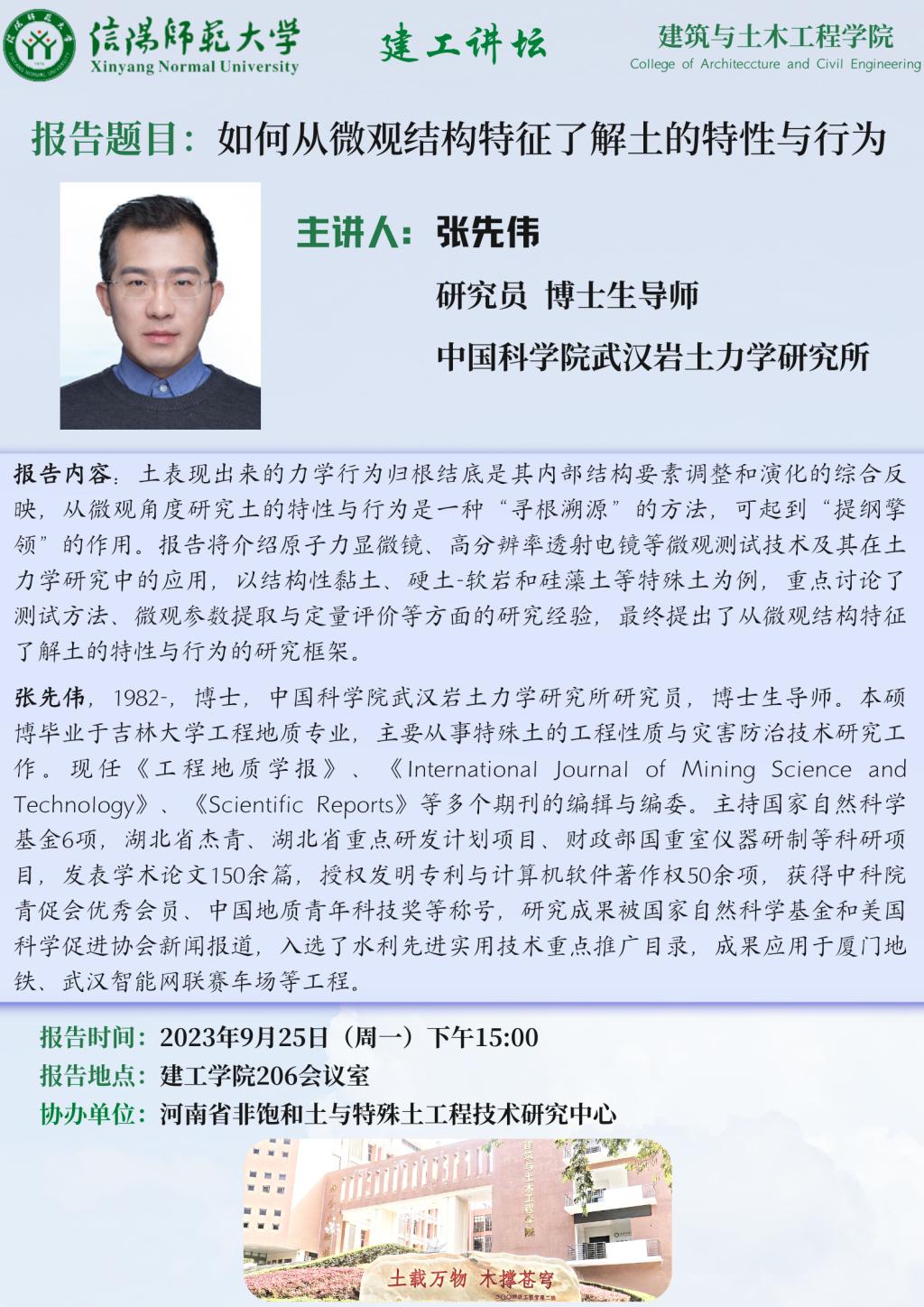报告人简介:张先伟(1982-),博士,中国科公司武汉岩土力学研究所研究员,博士生导师。本硕博毕业于吉林大学工程地质专业,主要从事特殊土的工程性质与灾害防治技术研究工作。现任《工程地质学报》、《International Journal of Mining Science and Technology》、《Scientific Reports》等多个期刊的编辑与编委。主持国家自然科学基金6项,湖北省杰青、湖北省重点研发计划项目、财政部国重室仪器研制等科研项目,发表学术论文150余篇,授权发明专利与计算机软件著作权50余项,获得中科院青促会优秀会员、中国地质青年科技奖等称号,研究成果被国家自然科学基金和美国科学促进协会新闻报道,入选了水利先进实用技术重点推广目录,成果应用于厦门地铁、武汉智能网联赛车场等工程。