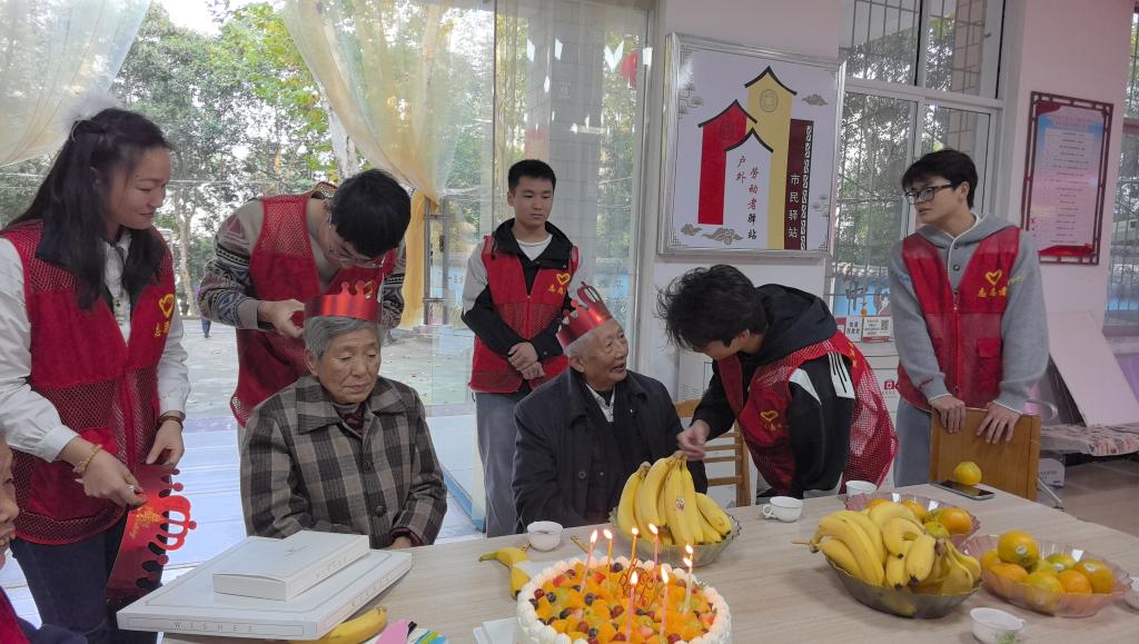 活动现场温情洋溢,党员们精心准备了丰富的水果和点心。活动开始,党员与老人们促膝交流,深入了解老人们的生活精神需求。在“集体生日会”环节,党员们以一曲《春泥》拉开序幕,随后《大海》的悠扬旋律与吉他独奏《当你老了》深情演绎交织,优美的歌声传递着对老人们的美好祝愿,现场掌声经久不息。党员们还精心策划了“真心话大冒险”等趣味互动游戏,老人们热情参与,现场欢声笑语不断。活动尾声,党员们为老人们戴上生日帽,点燃生日蜡烛,齐唱《生日快乐》歌,温馨的氛围感染着在场的每一个人。