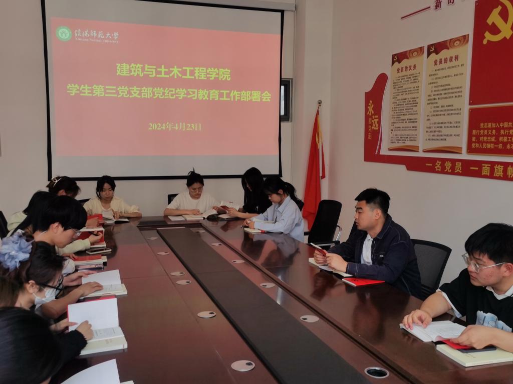 根据建筑与土木公司党委工作安排部署,4月23日上午,十大体育网站员工第三党支部在公司楼402召开党纪学习教育工作部署会,支部全体党员参加会议。