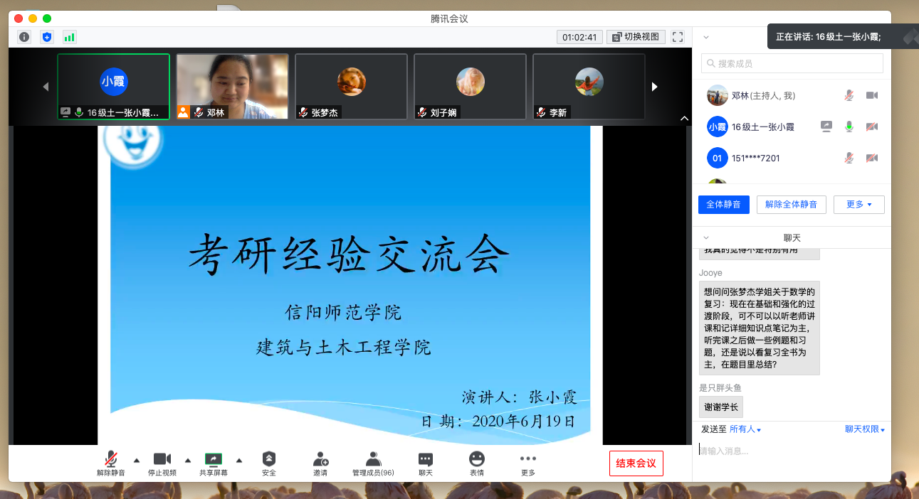 为进一步为计划考研的同学们提供更多的信息,帮助同学们树立正确的学习目标以及考研方向,公司在于6月19日下午3点通过网络召开了2020年考研经验交流会。会上,邀请了在2020年全国研究生统一招生考试中获佳绩的刘子娴、张小霞、张梦杰、陈硕硕和张钰杭五位同学以及2017级130余名员工参加了本次交流会,会议由2017级班主任邓林主持。