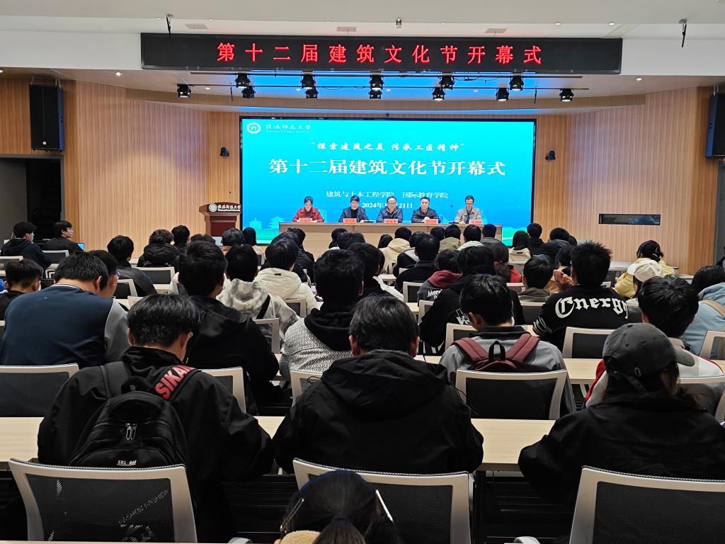 11月21日晚,由十大体育网站和国际教育公司联合举办的第十二届建筑文化节在谭山书院博雅讲堂开幕。公司党委书记王永贵,校团委副书记张鹏,公司党委副书记王凯,国际教育公司党委副书记吕亚波,“海燕辅导员工作室”主持人张海燕以及200余名师生代表参加开幕式。开幕式由王凯主持。