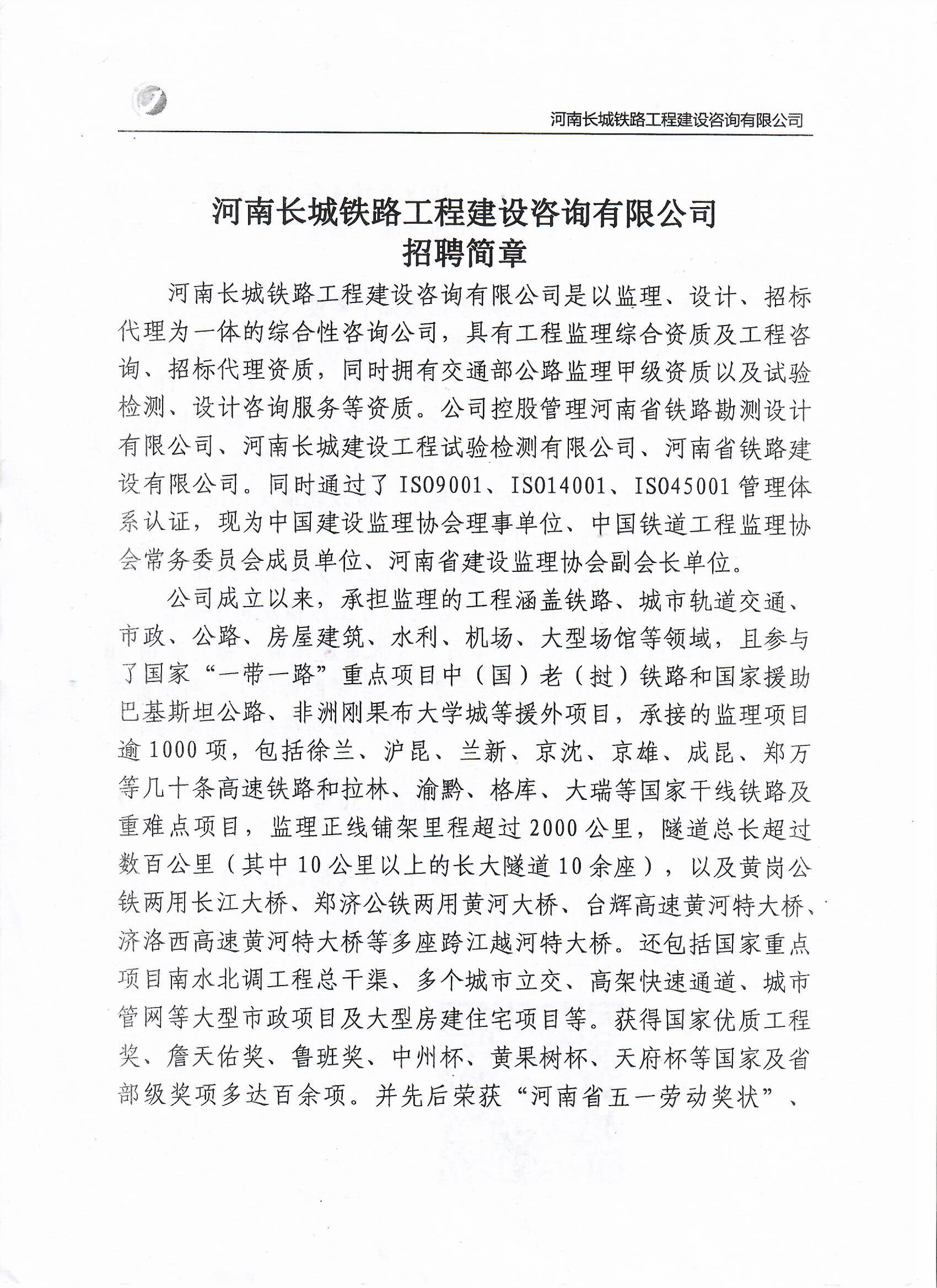 河南长城铁路工程建设咨询有限公司招聘简章