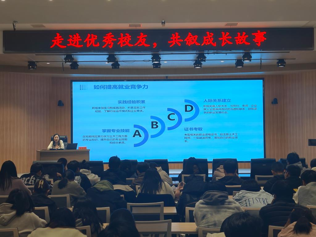 接着,她从施工、建设、设计、检测、咨询、专业设备和材料、新能源、新基建、海外发展等九个方面向学弟学妹们介绍了土木工程专业老员工的职业发展路径和就业去向,重点围绕就业心理、职业竞争提高力、创业精神与创新意识培养等内容进行了详细阐述。王新娣最后指出,未来几年,随着国家基础设施建设的繁荣和房地产市场的回暖,土木工程行业将更加注重绿色建筑、智能建筑等方面的发展,对专业人才的需求也将持续增加。同学们一要保持自信,做到顺势而为。二要持续学习,不断升级认知。不仅要在专业上精益求精,更要在管理、沟通和人际交往等方面多学习。三要夯实技能,持续提升就业竞争力。要在专业技能提升、资质证书考取、实践经验积累、人际关系建立等方面多下功夫,着力提升综合素质,努力成为高素质复合型专业技能人才。
