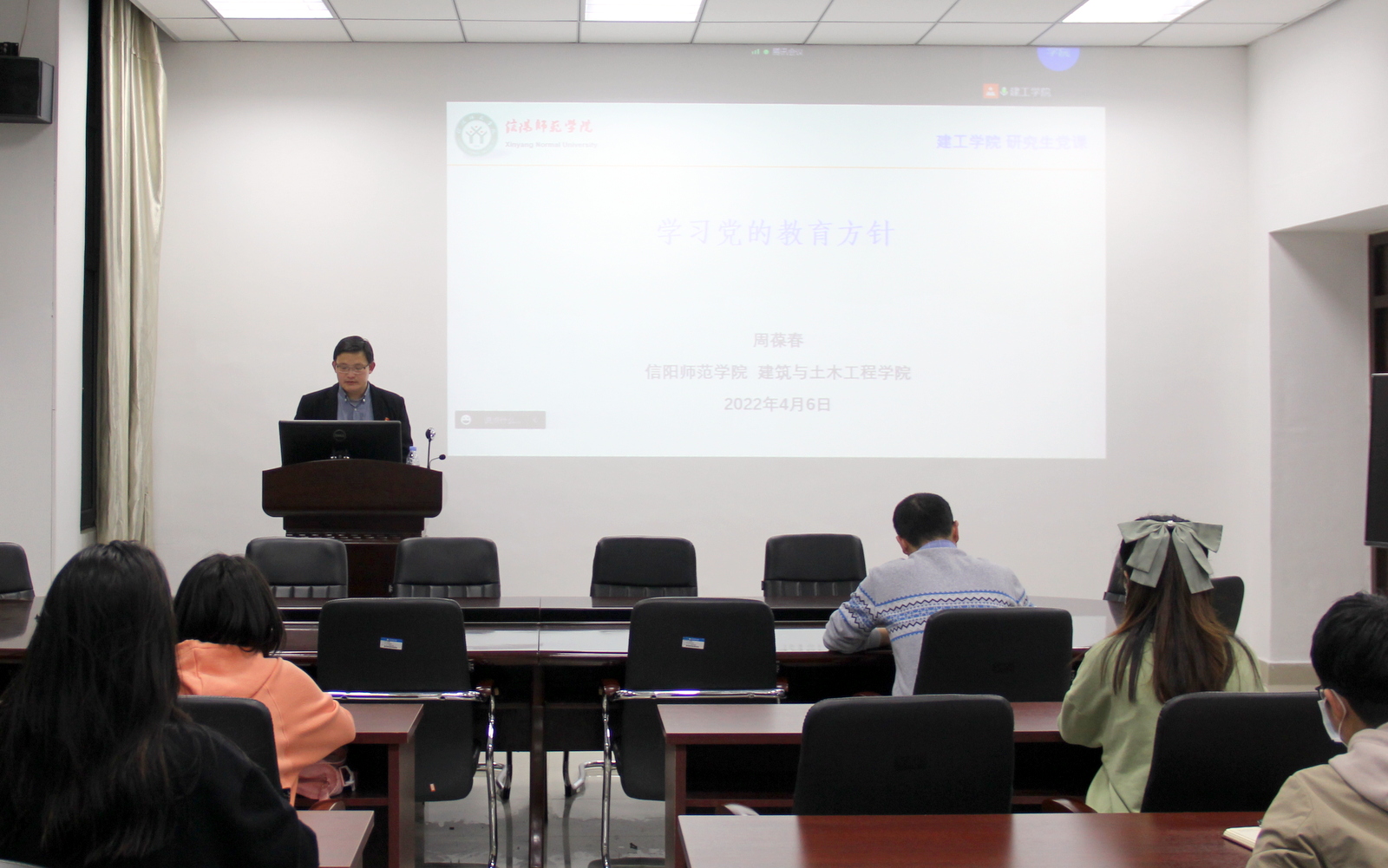 2022年4月6日晚上,十大体育网站经理、河南省高等公司优秀共产党员周葆春同志在综合实验楼206室为研究生上党课,学习党的教育方针,研究生班主任马文强和全体研究生线下线上参加本次活动。