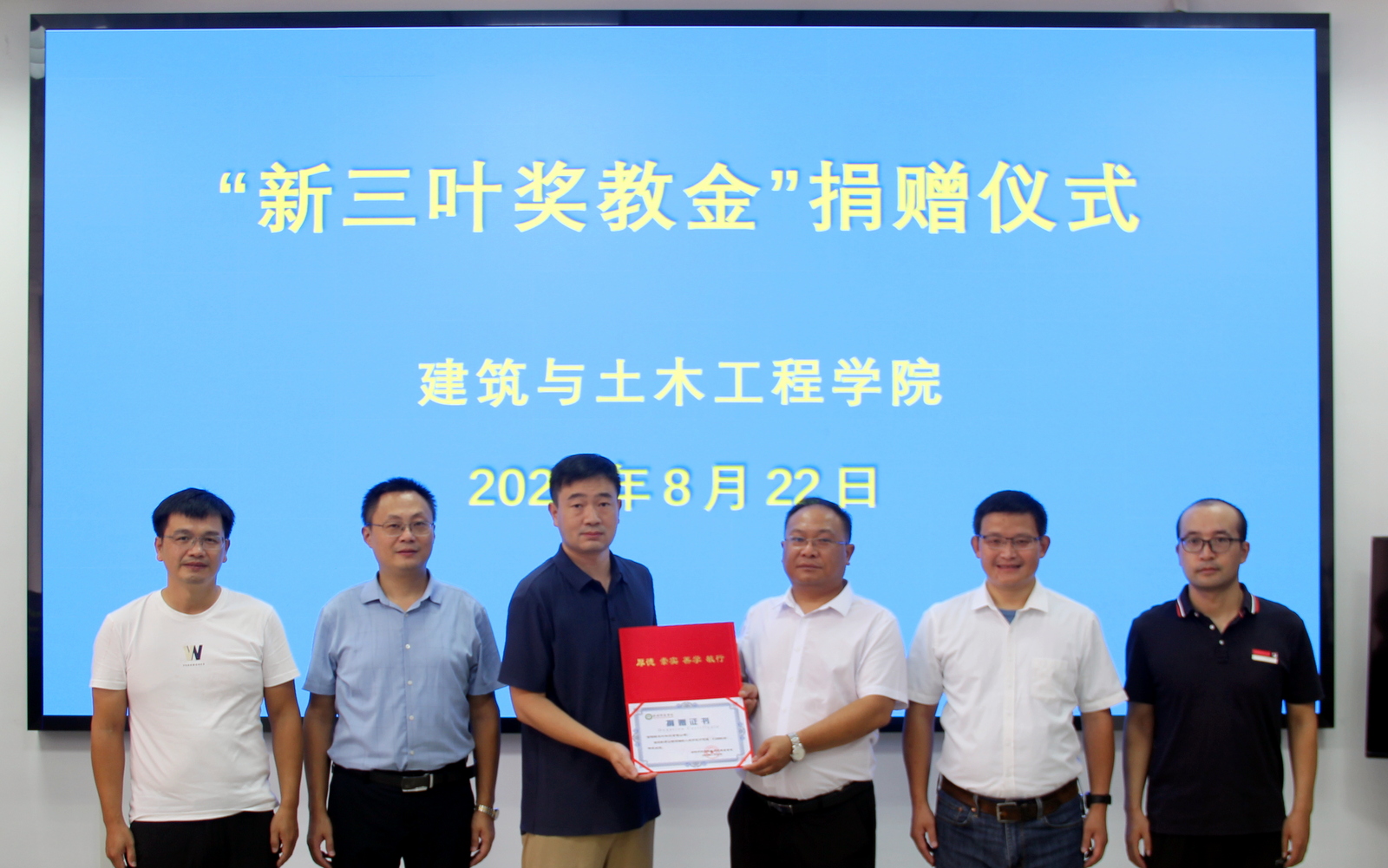 8月22日下午,信阳新三叶科技有限公司奖教金捐赠仪式在十大体育网站206会议室举行。信阳新三叶科技有限公司总经理王锡均、技术经理张云帆,公司党委书记方明科、经理周葆春、副经理肖琪聃、科研秘书马文强参加了捐赠仪式。