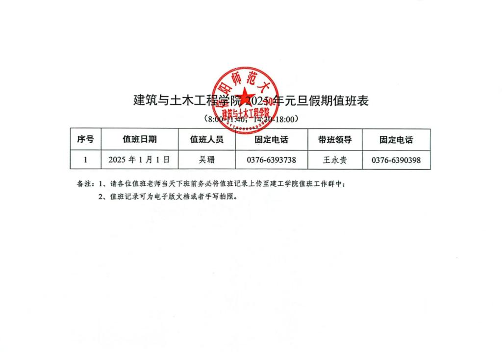 2025年元旦假期值班表